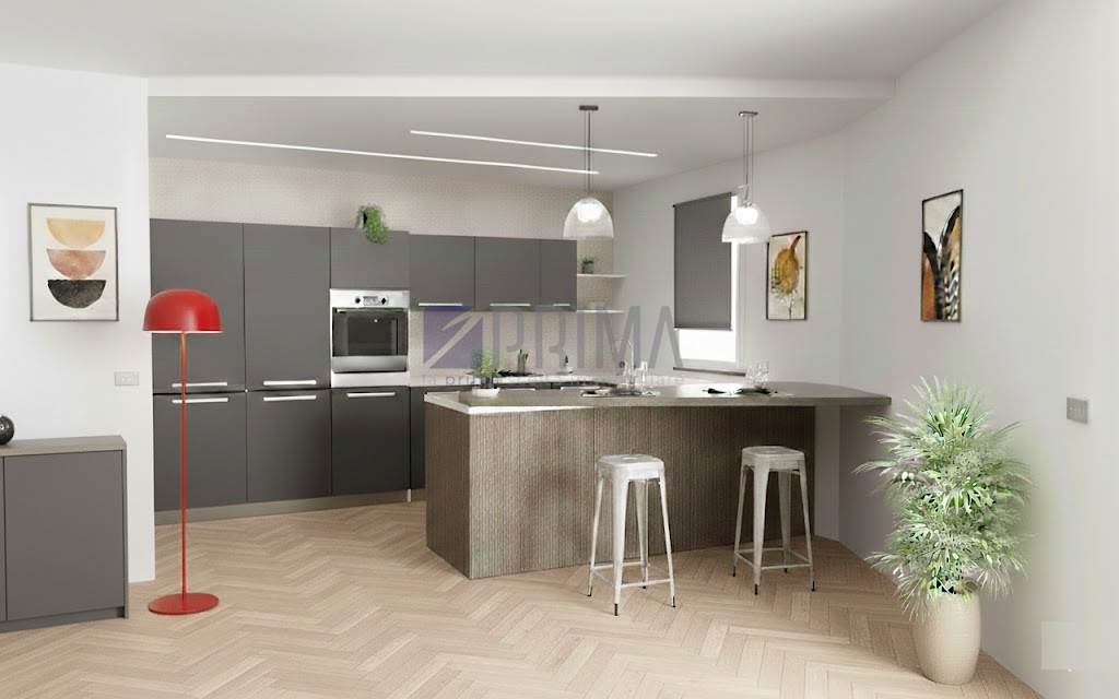 La zona giorno accoglie con un ampio living e una cucina a vista, un ambiente moderno e conviviale che si apre su una splendida terrazza di 18 mq, ideale per momenti di relax all’aria aperta.