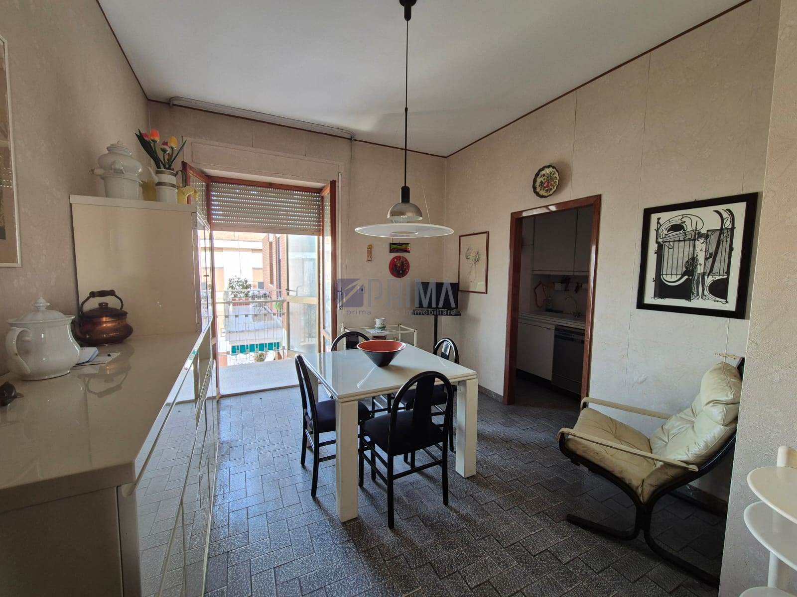 La zona giorno si divide tra una cucina abitabile con cucinino, un balcone in parte chiuso ad uso lavanderia ed un ampio salone inondato di luce che si affaccia su un secondo balcone.