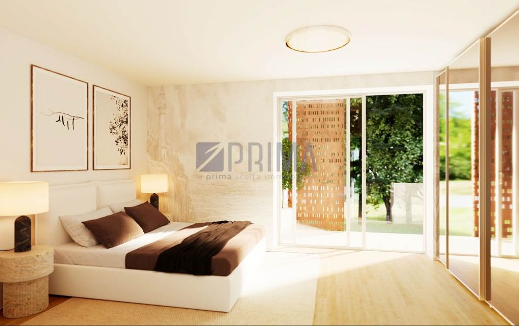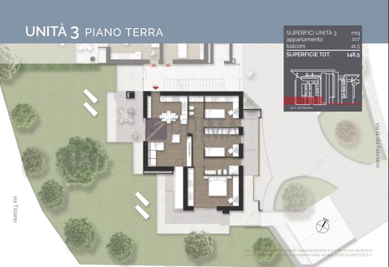 L’appartamento, di circa 107 mq posto al piano terra, si sviluppa su un unico livello ed è inserito nel prestigioso complesso residenziale Domus Gentilis.