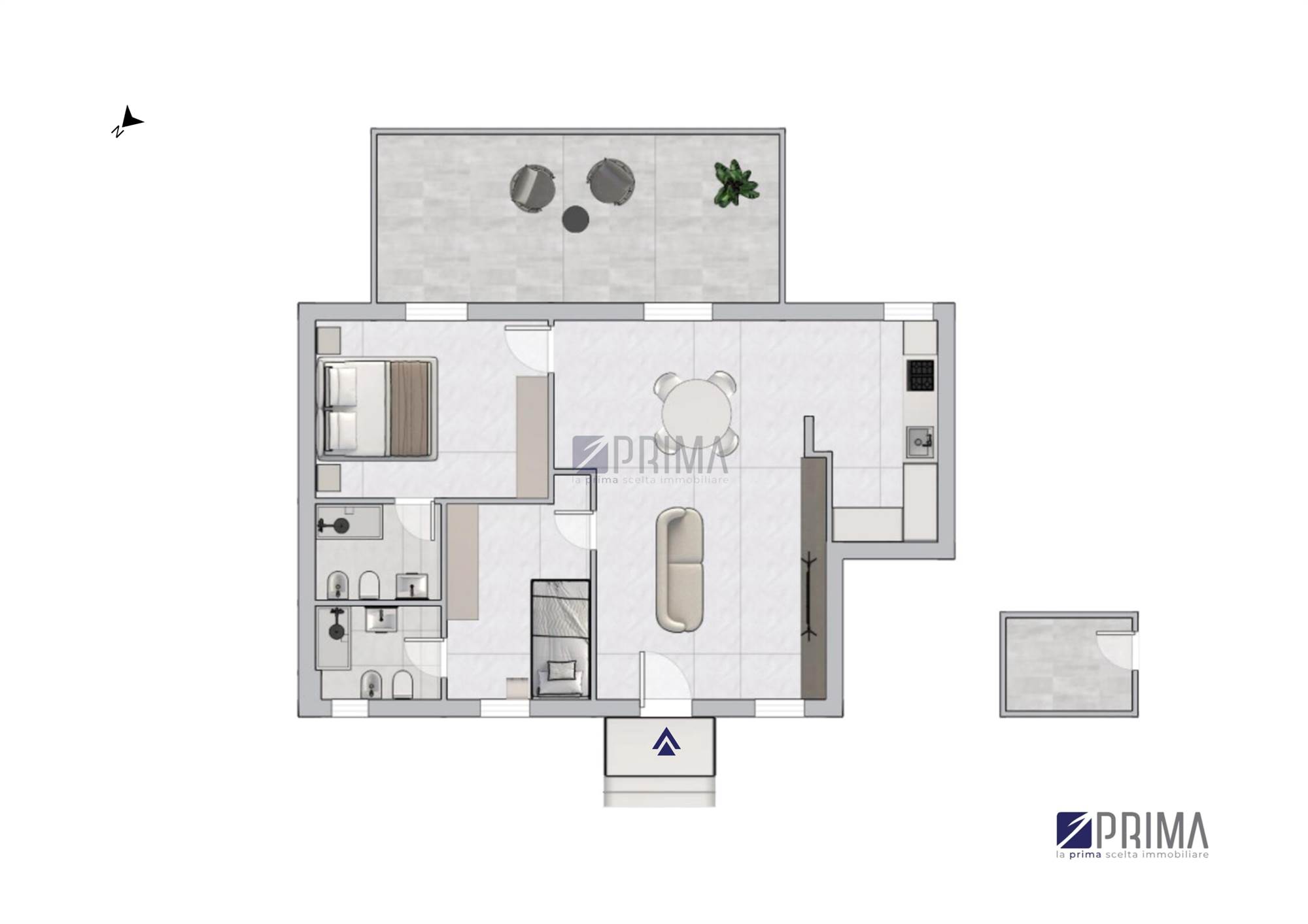 L’immobile, di circa 75 mq, si apre su un luminoso soggiorno con angolo cottura, dal quale si accede direttamente allo spazio esterno, ideale per vivere momenti di relax all’aria aperta. La zona notte è composta da una cameretta con bagno privato finestrato e da una camera matrimoniale sempre con bagno privato e accesso diretto alla corte esterna. Una distribuzione degli spazi studiata con attenzione, che garantisce comfort, privacy e massima funzionalità.